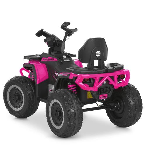 Потужність квадроцикла забезпечують чотири двигуни 4×35W, що працюють на напрузі 12V. Разом із якісною батареєю 12V/7AH вони створюють ідеальний баланс між силою та тривалістю поїздки. Максимальна швидкість до 8 км/год дозволяє отримати від катання справжній драйв, але при цьому зберегти необхідний рівень контролю та безпеки. Старт здійснюється за допомогою зручної кнопки — простий і зрозумілий механізм, з яким легко впорається навіть найменший водій.