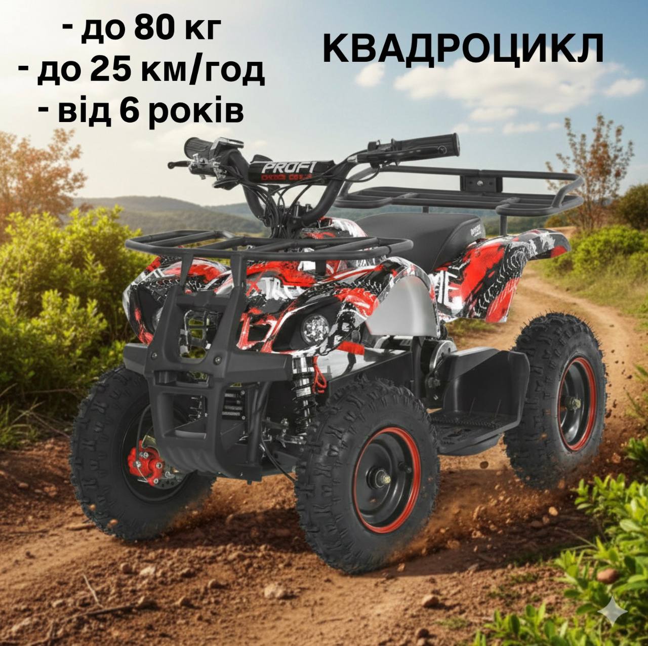 Дитячий електроквадроцикл Bambi з потужним двигуном 800W та гумовими колесами, червоний