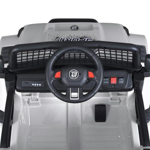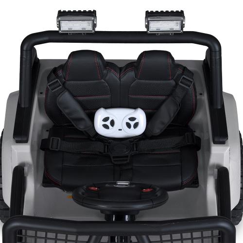 Сидіння з м’якої еко-шкіри забезпечує комфортну посадку під час поїздок, а двохточковий ремінь безпеки гарантує надійне закріплення дитини. Ширина посадкового місця становить 37 см, що дає достатньо простору для дитини різного віку. Двері які відчиняються та багажник додають реалістичності і функціональності цьому електромобілю, дозволяючи перевозити невеликі речі чи використовувати багажник для ігор.