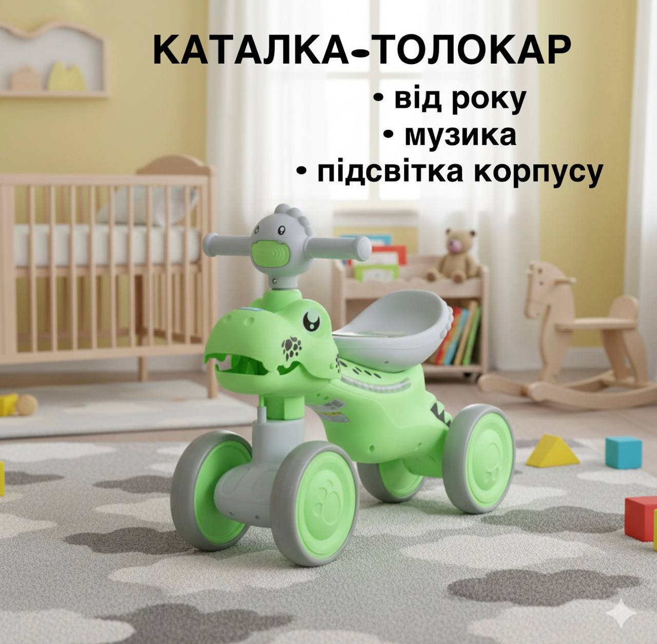 Детский толокар-беговел Bambi Pokemon Dino с подвижной челюстью и подсветкой, светло-зеленый