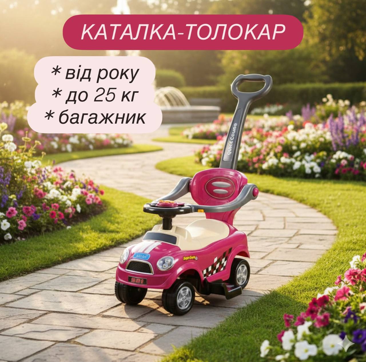 Розміри каталки-толокара (ДхШхВ з батьківською ручкою): 84,5х45,5х84,5 см.